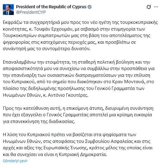 “Birleşmiş Milletler Genel Sekreteri Sayın Antonio Guterres’in açıkladığı taahhüt çerçevesinde, Kıbrıs sorununun çözümüne yönelik esaslı müzakerelerin Crans Montana’da kesintiye uğradığı noktadan itibaren yeniden başlatılmasına yönelik çabalara katkıda bulunmaya hazır olduğumu, güçlü siyasi irademi ve kararlılığımı yineliyorum. Bu doğrultuda, Genel Sekreter tarafından duyurulan önümüzdeki gayrı resmi genişletilmiş toplantı, sürecin yeniden başlatılması için önemli bir fırsat teşkil etmektedir. Kıbrıs sorununun çözümü Birleşmiş Milletler kararları, Güvenlik Konseyi kararları ve Kıbrıs Cumhuriyeti’nin üyesi olduğu ve olmaya devam edeceği Avrupa Birliği’nin ilke ve değerleri temelinde olmalıdır.”